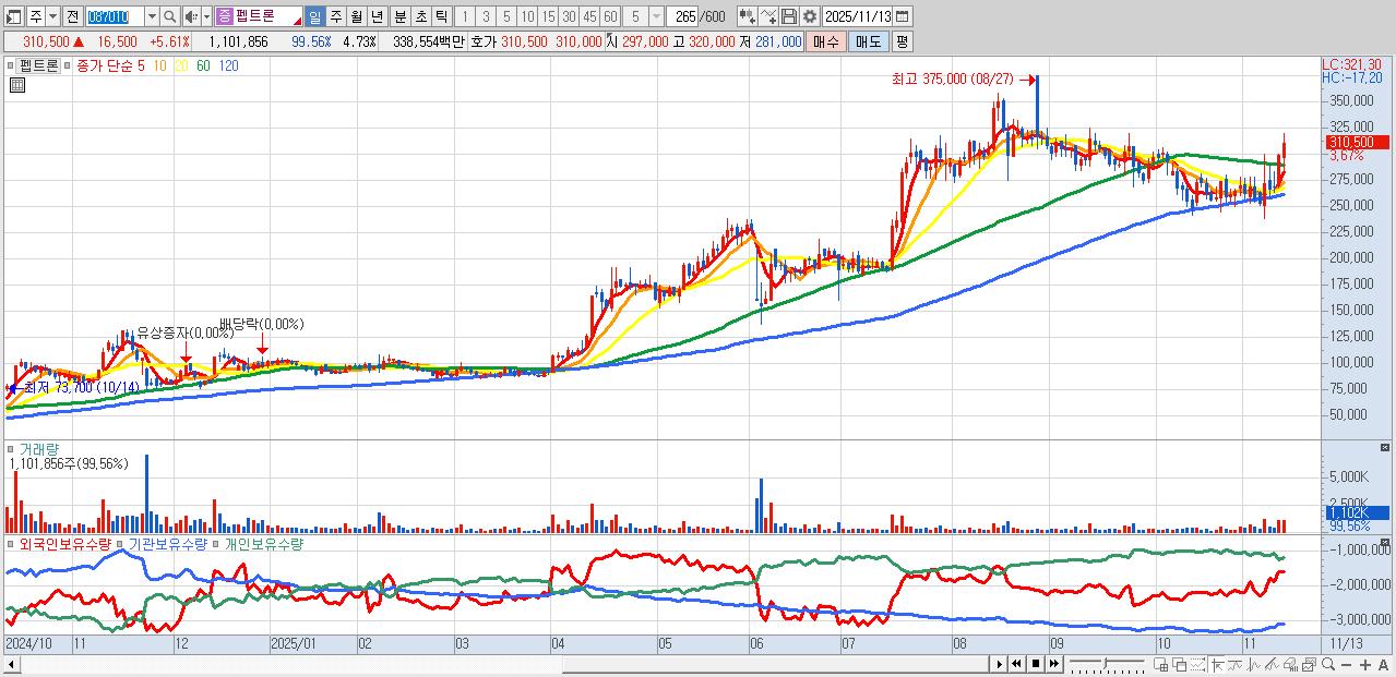 - 펩트론 (311,000원 ▲ 5.78% , 시총: 72,517억, 거래량: 651,067, 거래대금:1,998억)