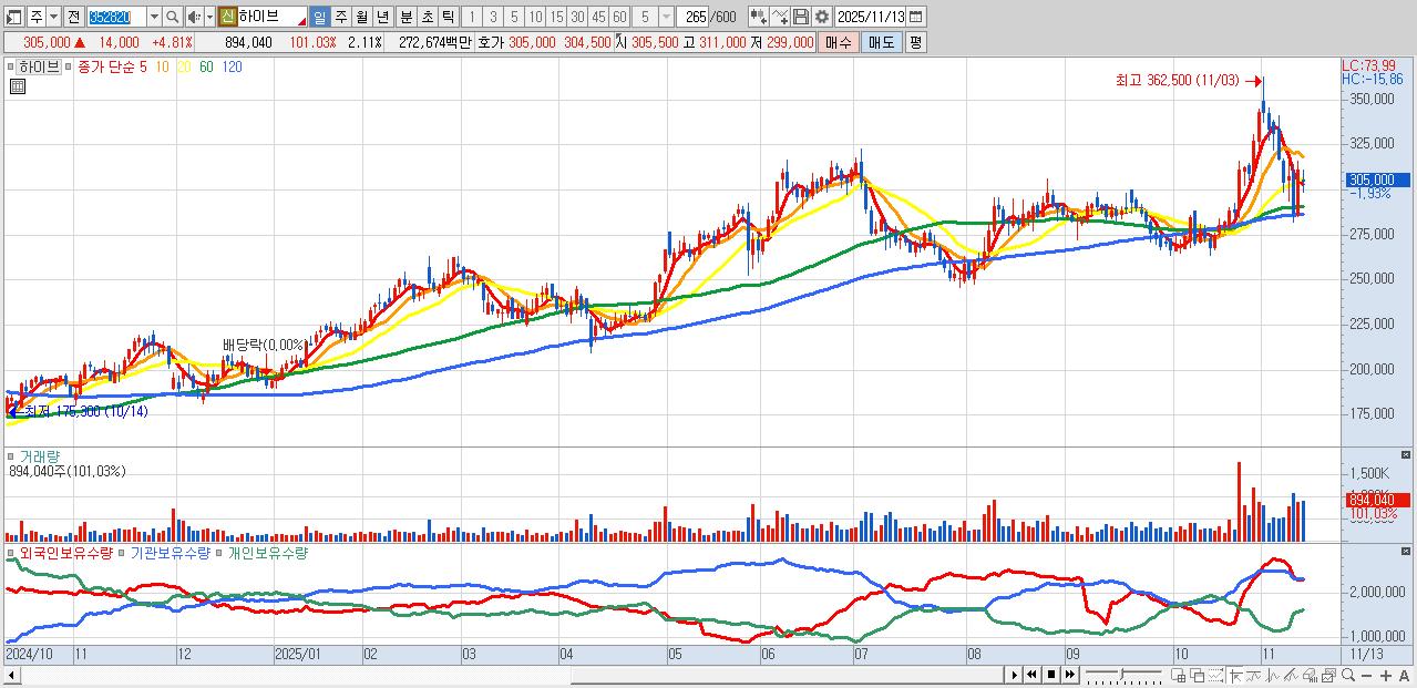 - 하이브 (304,000원 ▲ 4.47% , 시총: 128,616억, 거래량: 650,389, 거래대금:1,984억)