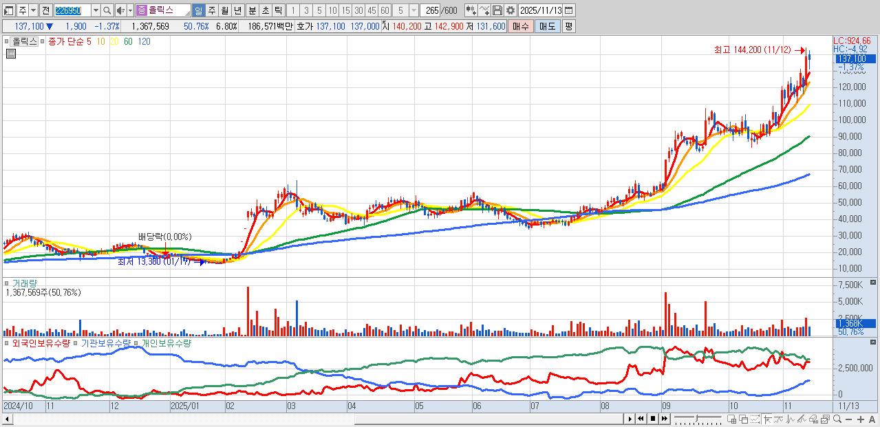 - 올릭스 (137,100원 ▼ -1.37% , 시총: 27,577억, 거래량: 1,367,569, 거래대금:1,866억)