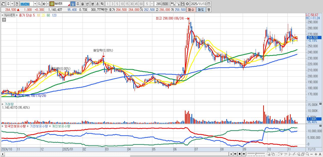- NAVER (265,500원 ▲ 0.76% , 시총: 416,444억, 거래량: 724,253, 거래대금:1,910억)