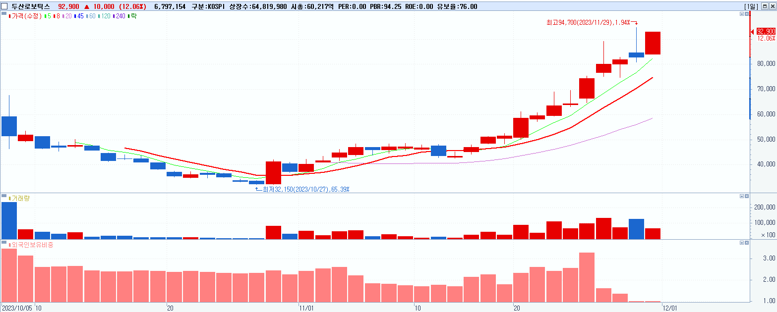 - 두산로보틱스 (92,900원 ▲ 12.06% , 시총: 60,218억, 거래량: 6,811,597, 거래대금:6,027억)