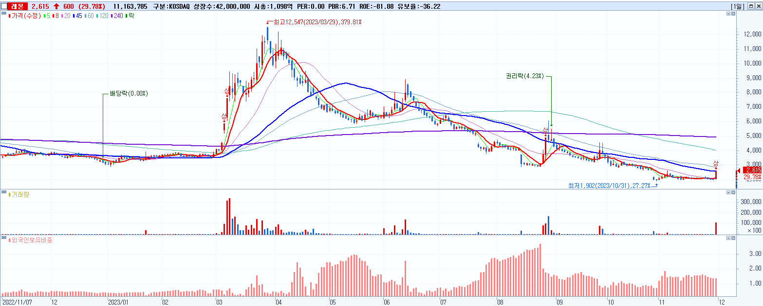 4.레몬 2,615원 ▲ 29.78% (KOSDAQ, 294140)