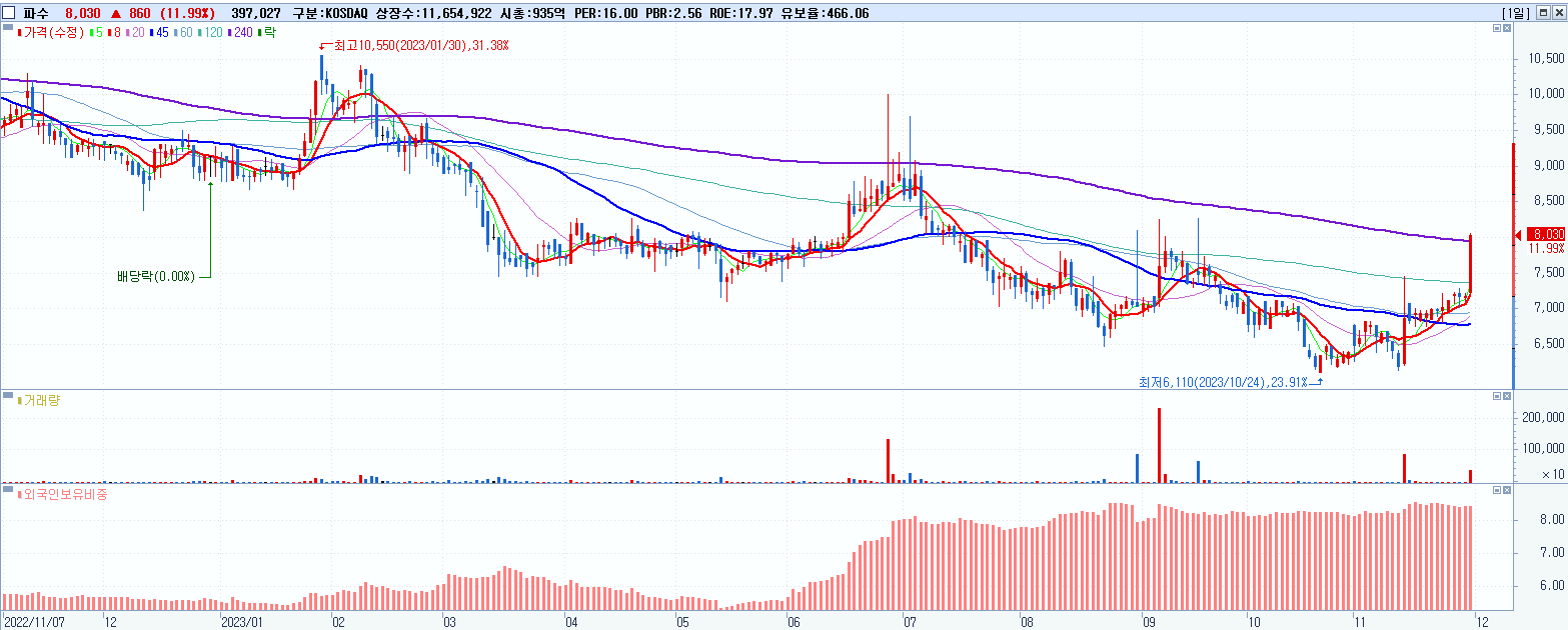- 파수 (8,030원 ▲ 11.99% , 시총: 936억, 거래량: 397,039, 거래대금:31억)