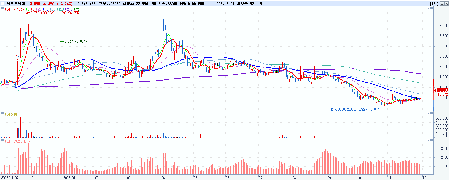 - 웰크론한텍 (3,850원 ▲ 13.24% , 시총: 870억, 거래량: 9,346,078, 거래대금:369억)