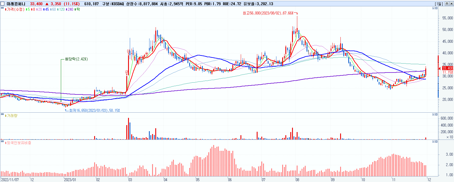 - 미래컴퍼니 (33,400원 ▲ 11.15% , 시총: 2,945억, 거래량: 610,210, 거래대금:201억)