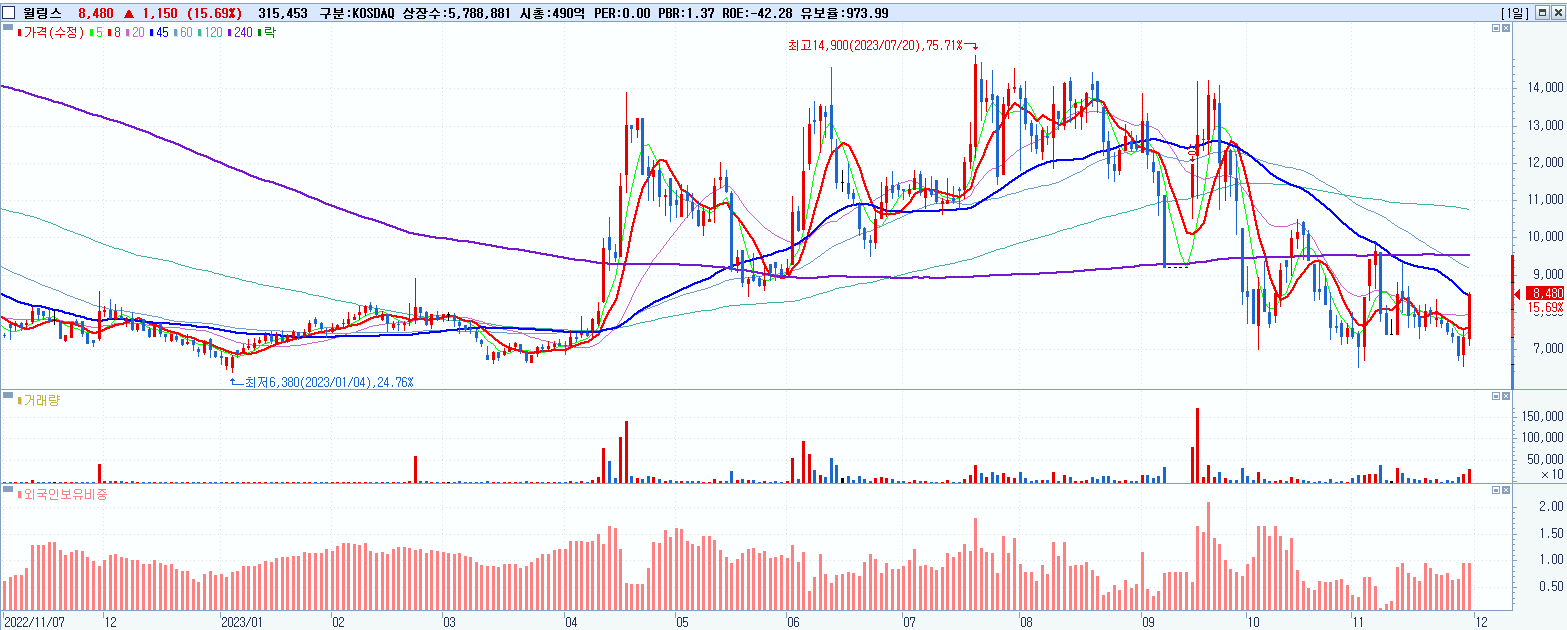 - 윌링스 (8,480원 ▲ 15.69% , 시총: 491억, 거래량: 316,023, 거래대금:25억)