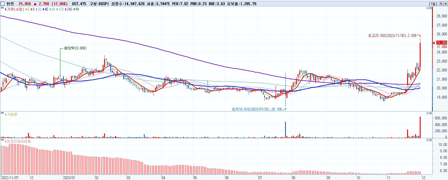 - 한진 (25,050원 ▲ 12.08% , 시총: 3,744억, 거래량: 657,525, 거래대금:162억)