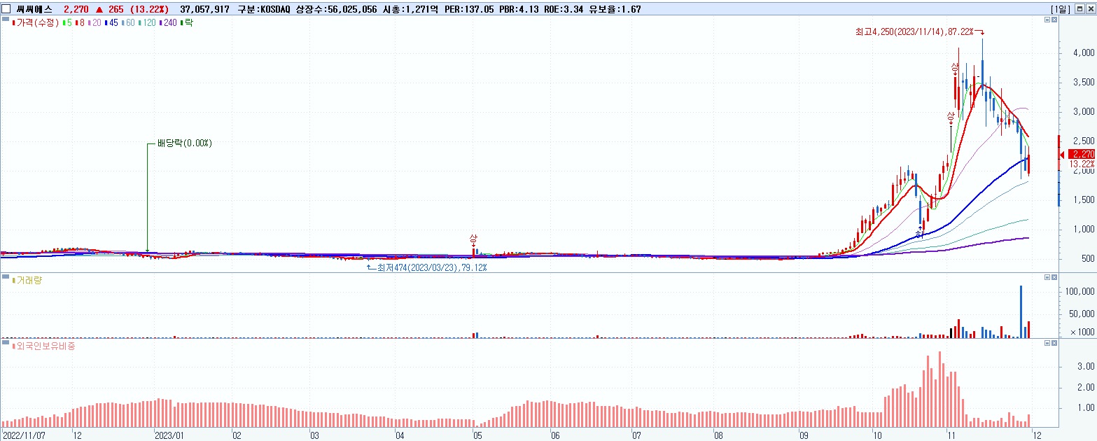 - 씨씨에스 (2,270원 ▲ 13.22% , 시총: 1,272억, 거래량: 37,101,210, 거래대금:804억)