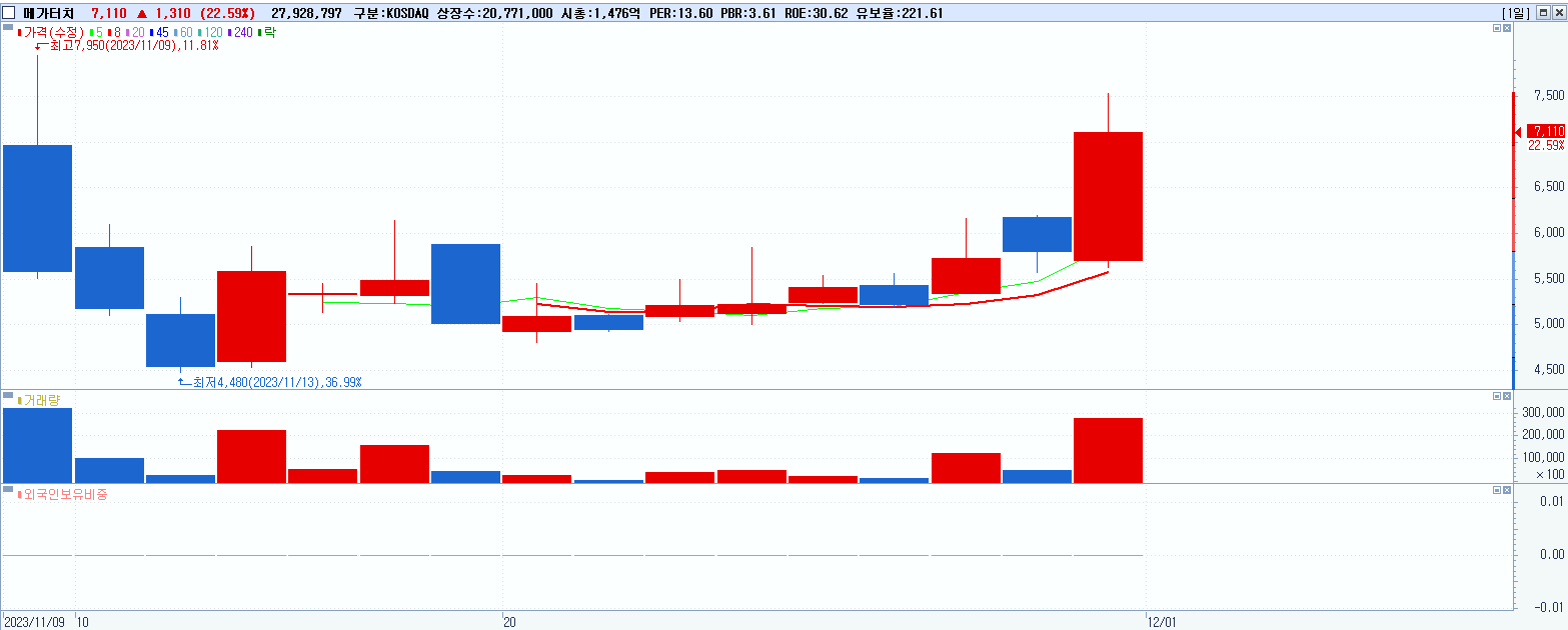 - 메가터치 (7,110원 ▲ 22.59% , 시총: 1,477억, 거래량: 27,948,016, 거래대금:1,941억)
