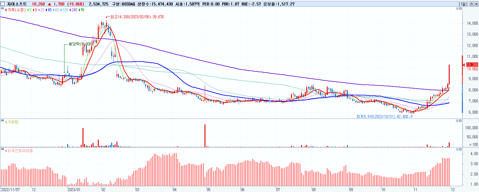 - 지어소프트 (10,260원 ▲ 19.86% , 시총: 1,588억, 거래량: 2,538,764, 거래대금:246억)