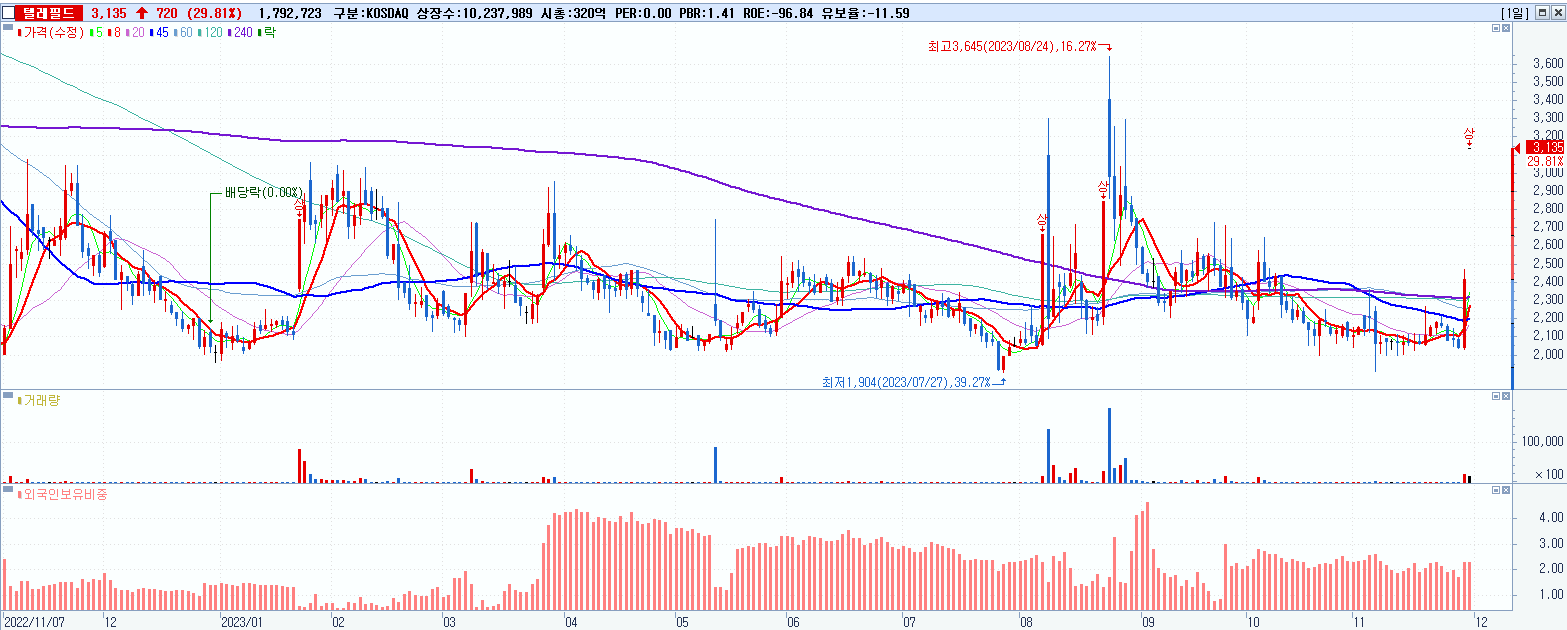 - 텔레필드 (3,135원 ▲ 29.81% , 시총: 321억, 거래량: 1,792,723, 거래대금:56억)