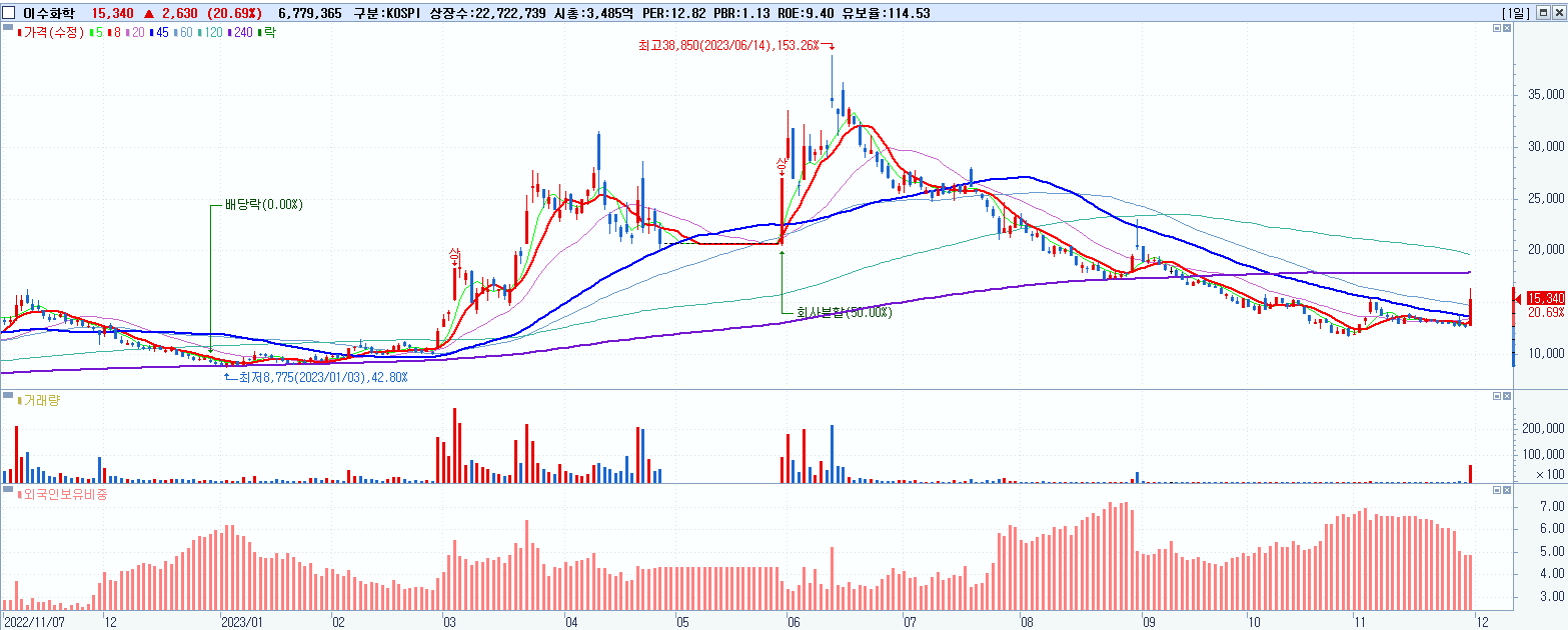 - 이수화학 (15,340원 ▲ 20.69% , 시총: 3,486억, 거래량: 6,782,071, 거래대금:1,054억)