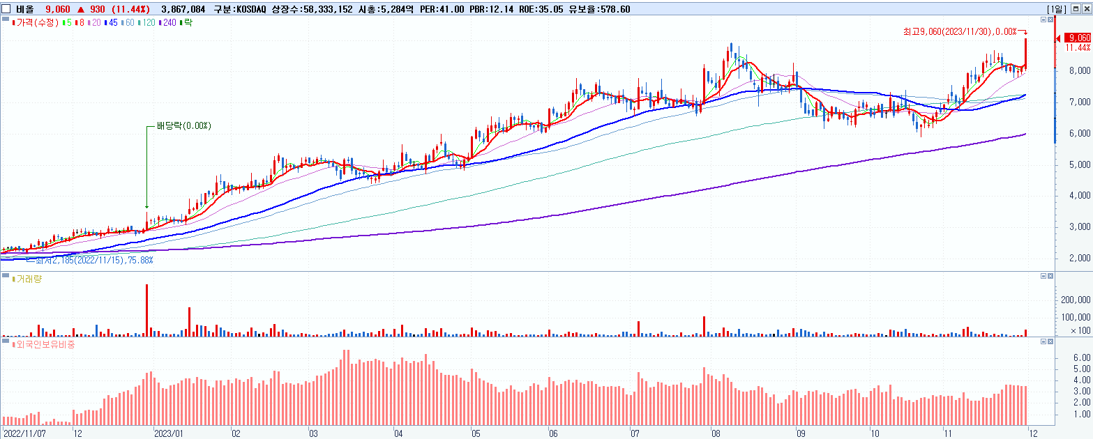 - 비올 (9,060원 ▲ 11.44% , 시총: 5,285억, 거래량: 3,870,220, 거래대금:335억)