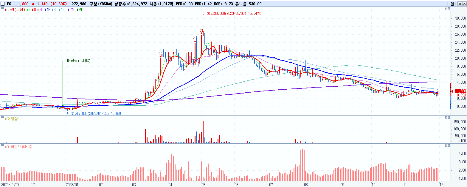 - EG (11,800원 ▲ 10.69% , 시총: 1,018억, 거래량: 272,986, 거래대금:31억)