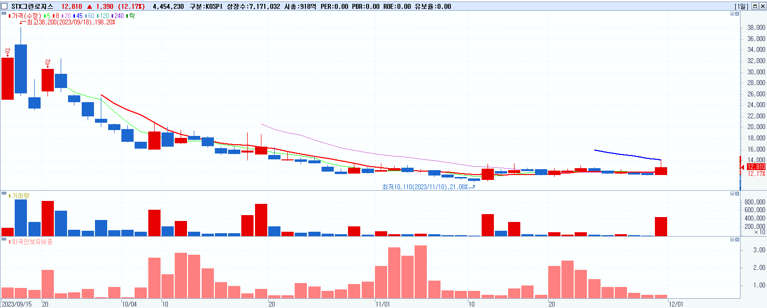 - STX그린로지스 (12,810원 ▲ 12.17% , 시총: 919억, 거래량: 4,470,574, 거래대금:580억)