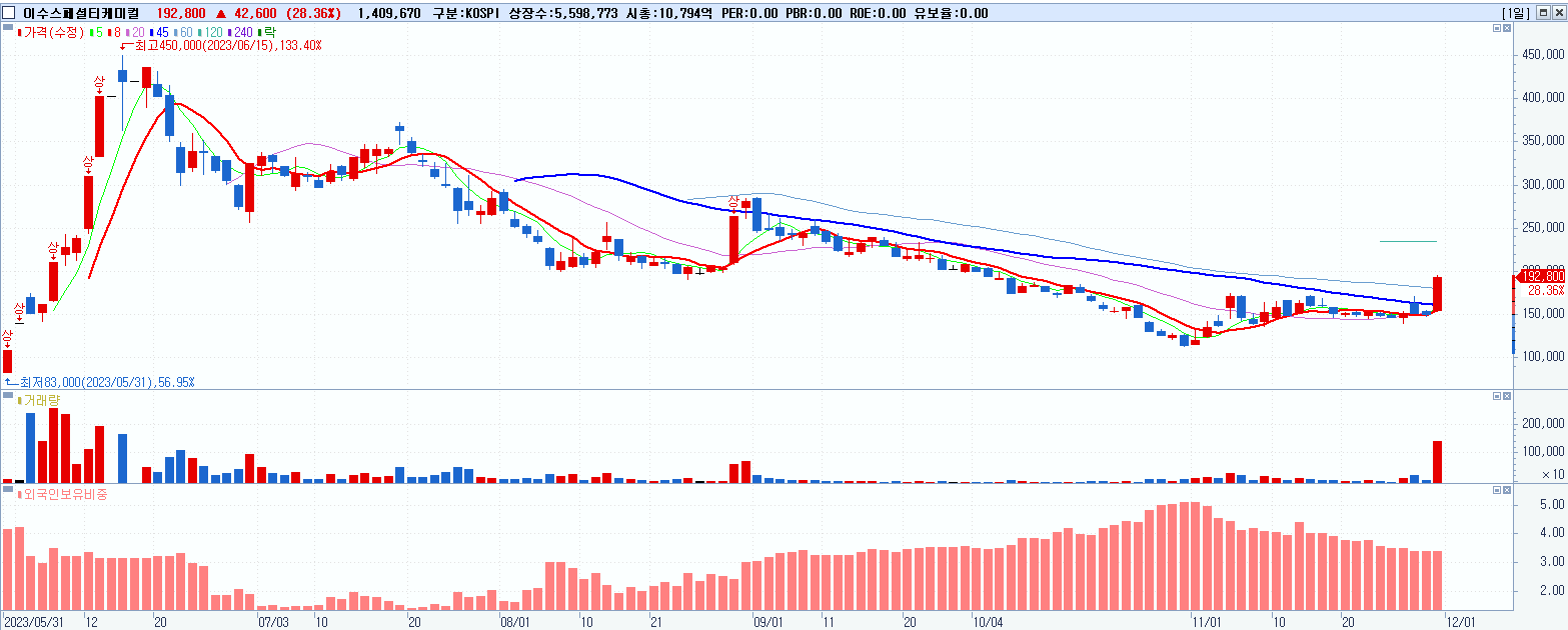 - 이수스페셜티케미컬 (192,800원 ▲ 28.36% , 시총: 10,794억, 거래량: 1,411,085, 거래대금:2,637억)