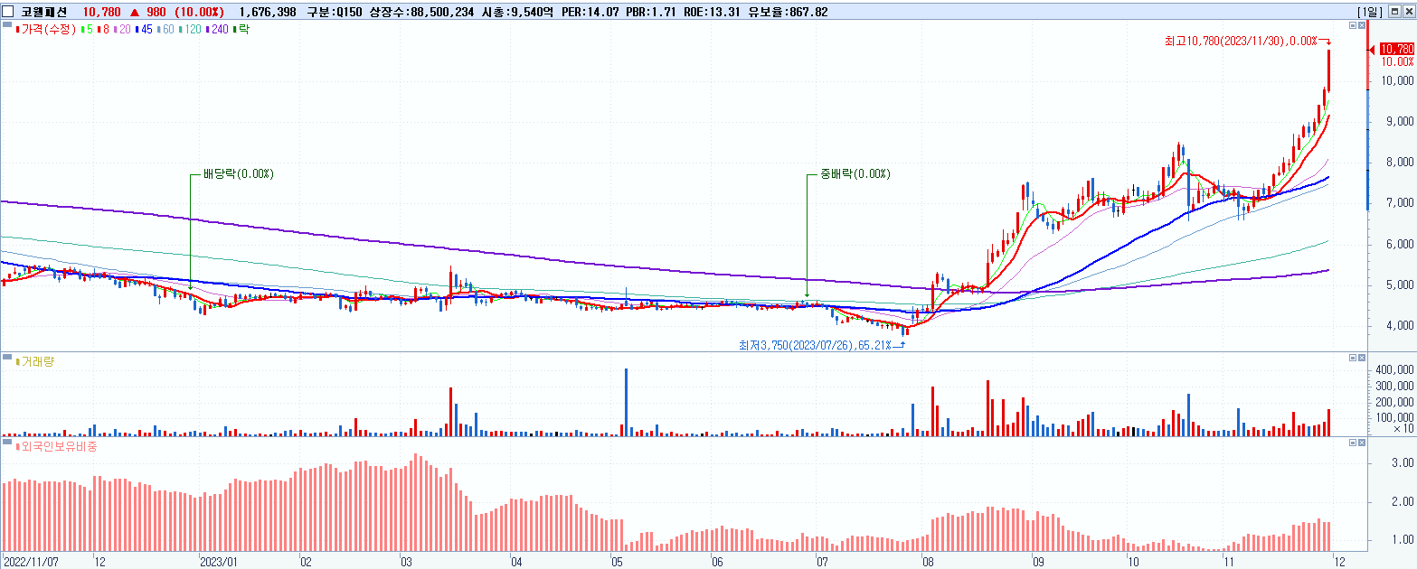 - 코웰패션 (10,780원 ▲ 10% , 시총: 9,540억, 거래량: 1,679,616, 거래대금:174억)