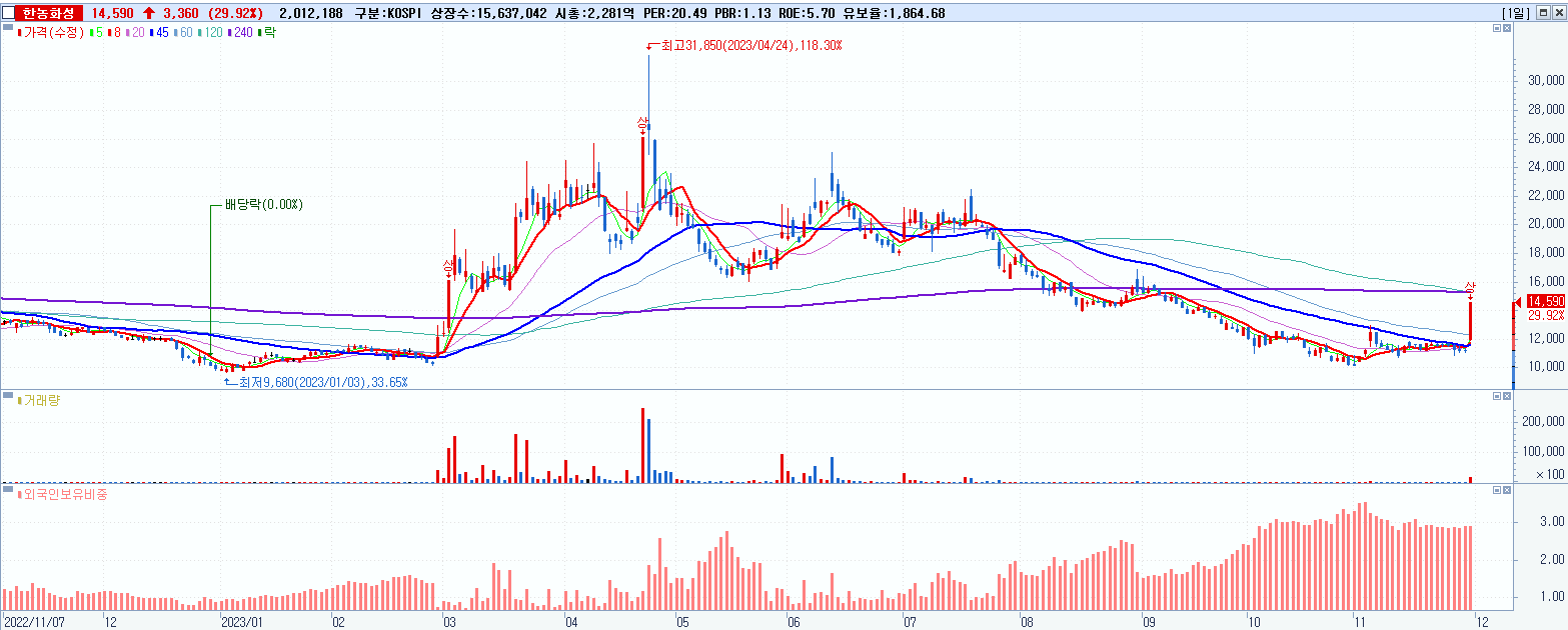 - 한농화성 (14,590원 ▲ 29.92% , 시총: 2,281억, 거래량: 2,012,232, 거래대금:282억)