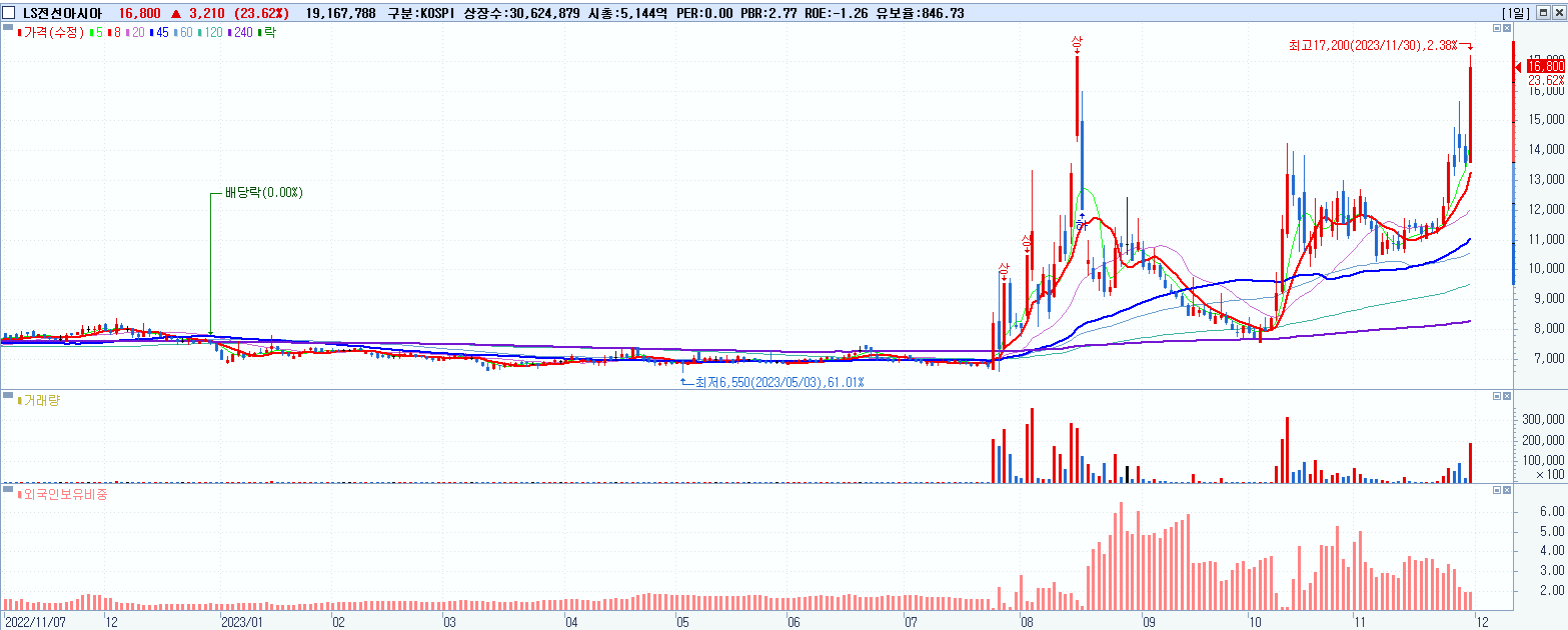 - LS전선아시아 (16,800원 ▲ 23.62% , 시총: 5,145억, 거래량: 19,176,459, 거래대금:3,072억)