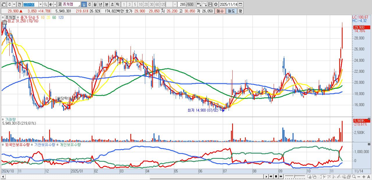 - 퓨쳐켐 (29,900원 ▲ 14.78% , 시총: 6,609억, 외국인 순매수 거래금:60억)