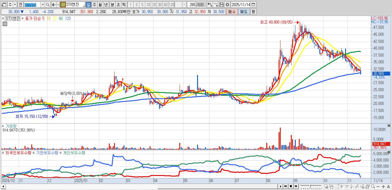 - STX엔진 (30,900원 ▼ -4.33% , 시총: 12,406억, 외국인 순매수 거래금:69억)
