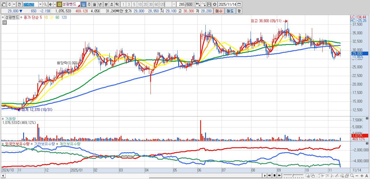 - 성광벤드 (28,800원 ▼ -2.87% , 시총: 7,649억, 외국인 순매수 거래금:184억)