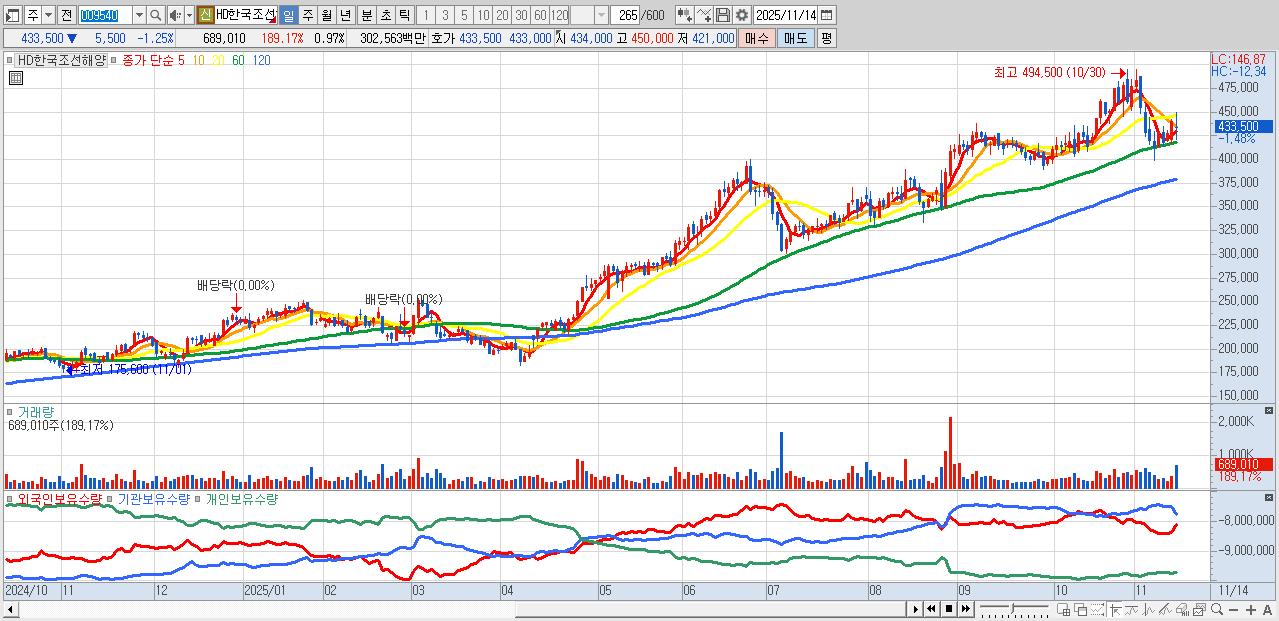 1.HD한국조선해양 432,000원 ▼ -1.59% (KOSPI, 009540)