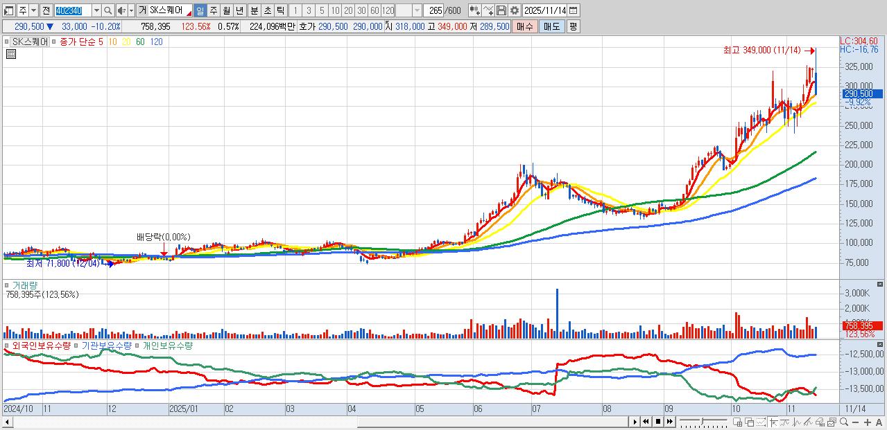 - SK스퀘어 (291,000원 ▼ -10.05% , 시총: 385,694억, 거래량: 595,985, 거래대금:1,755억)