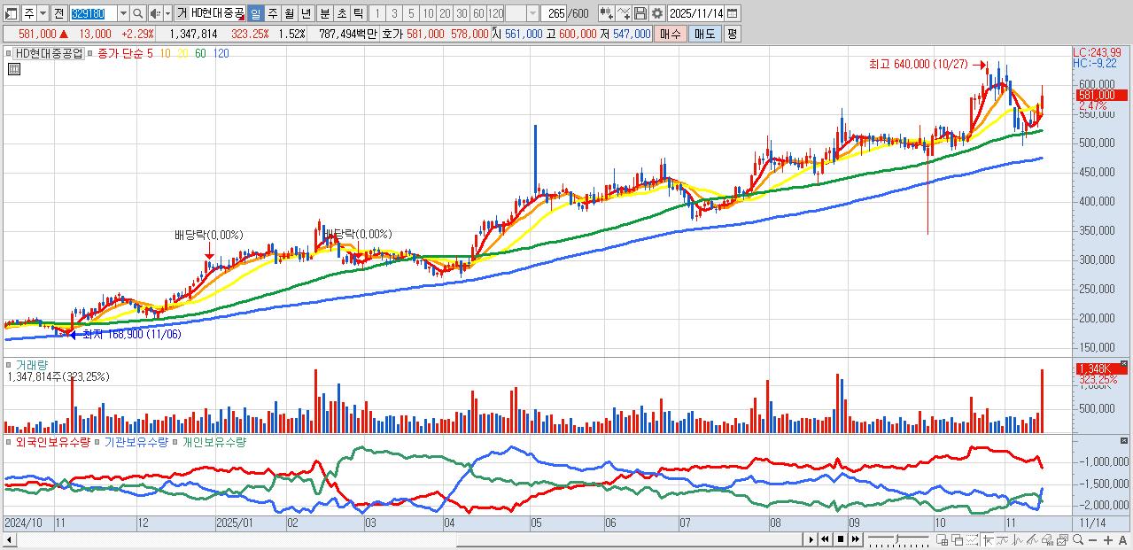 - HD현대중공업 (586,000원 ▲ 3.17% , 시총: 520,210억, 거래량: 1,117,932, 거래대금:6,538억)
