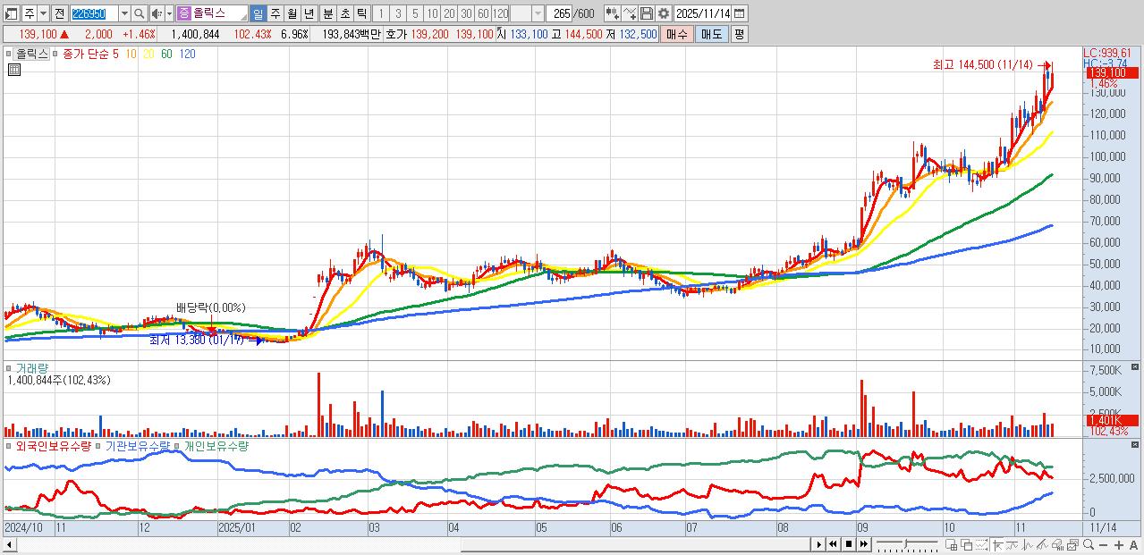 - 올릭스 (139,100원 ▲ 1.46% , 시총: 27,980억, 거래량: 1,400,844, 거래대금:1,938억)