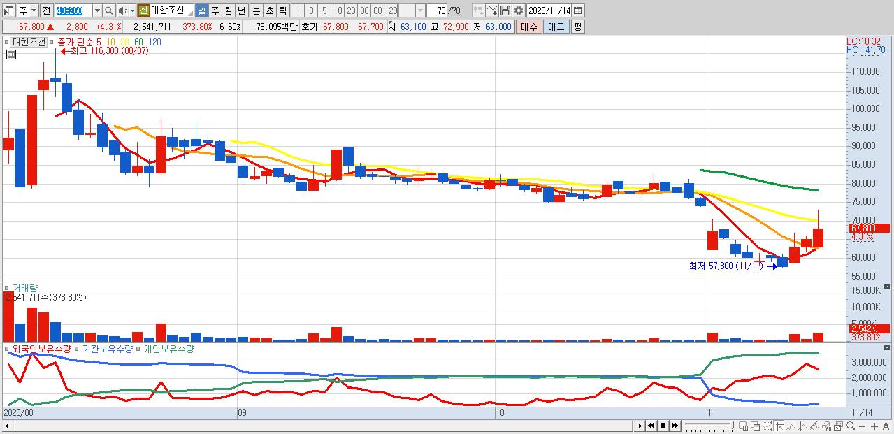 - 대한조선 (67,800원 ▲ 4.31% , 시총: 26,121억, 거래량: 2,541,711, 거래대금:1,761억)