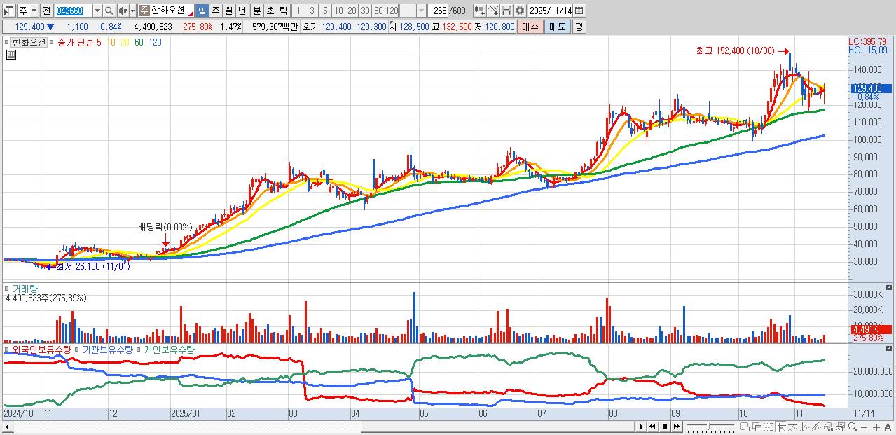 - 한화오션 (129,100원 ▼ -1.07% , 시총: 395,580억, 거래량: 2,817,706, 거래대금:3,636억)