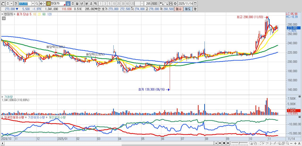 - 현대차 (272,500원 ▼ -2.15% , 시총: 557,965억, 거래량: 579,023, 거래대금:1,586억)