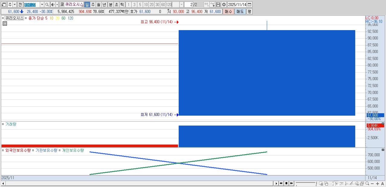 - 큐리오시스 (61,600원 ▼ -30% , 시총: 4,685억, 거래량: 5,984,425, 거래대금:4,773억)