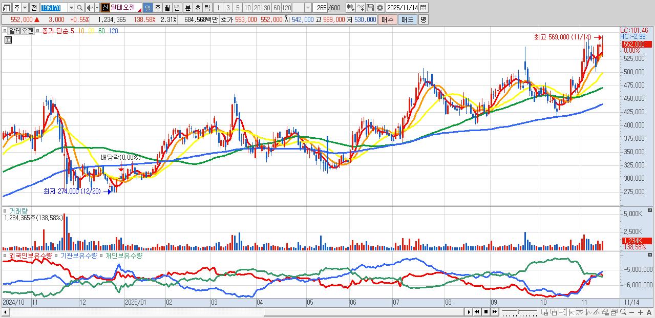 - 알테오젠 (554,000원 ▲ 0.91% , 시총: 296,422억, 거래량: 668,547, 거래대금:3,712억)