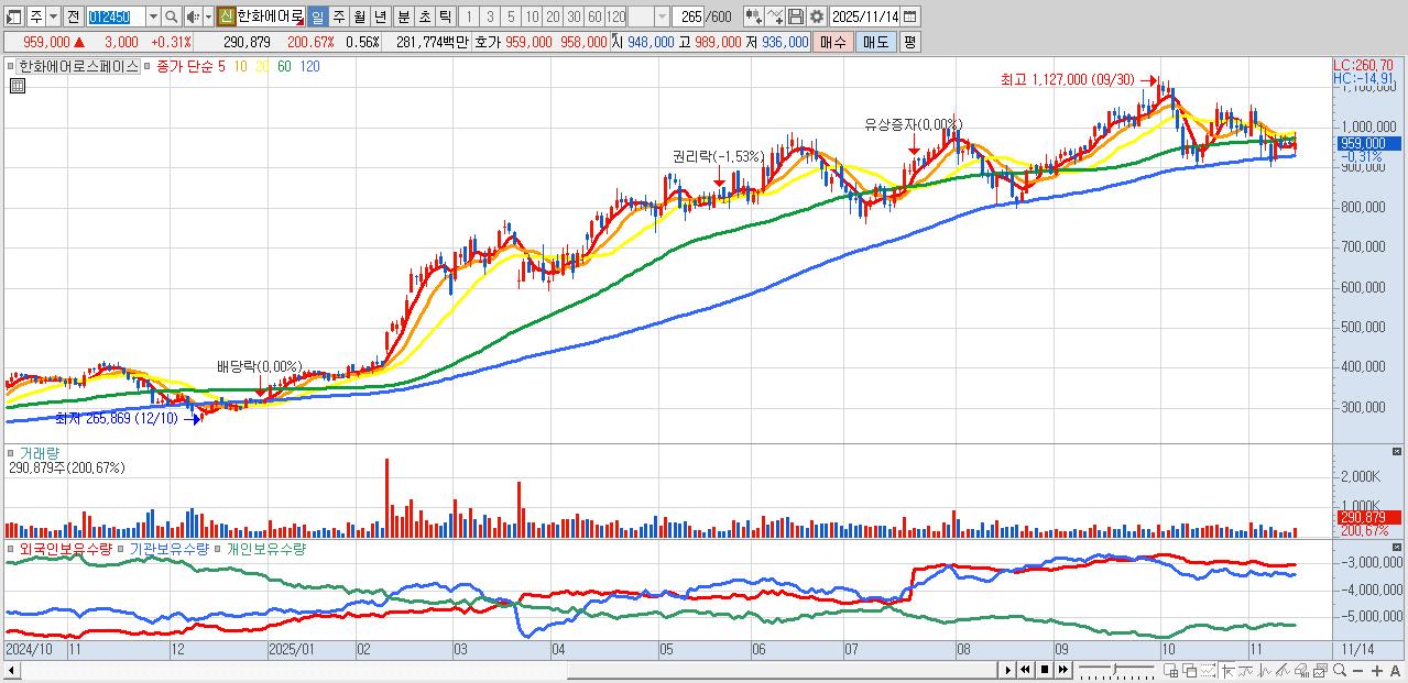 - 한화에어로스페이스 (955,000원 ▼ -0.1% , 시총: 492,430억, 거래량: 211,727, 거래대금:2,052억)
