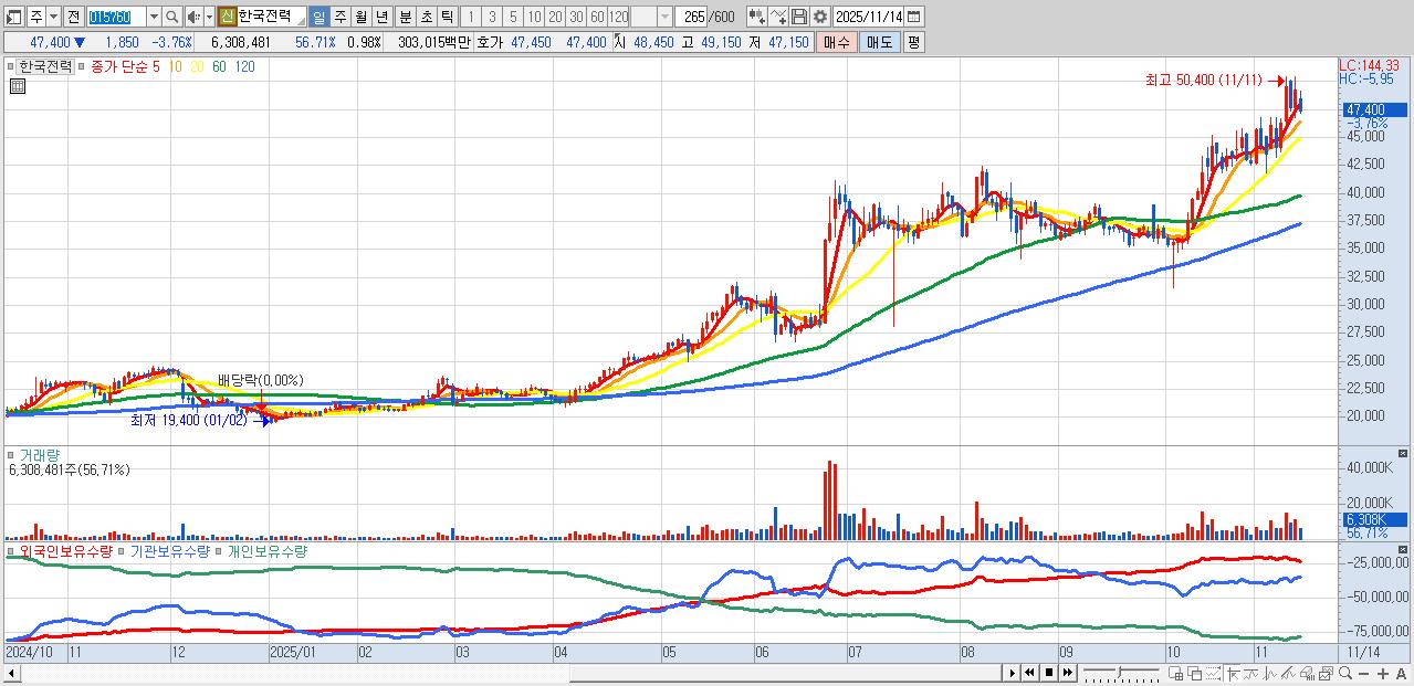 - 한국전력 (47,400원 ▼ -3.76% , 시총: 304,291억, 거래량: 6,308,481, 거래대금:3,030억)