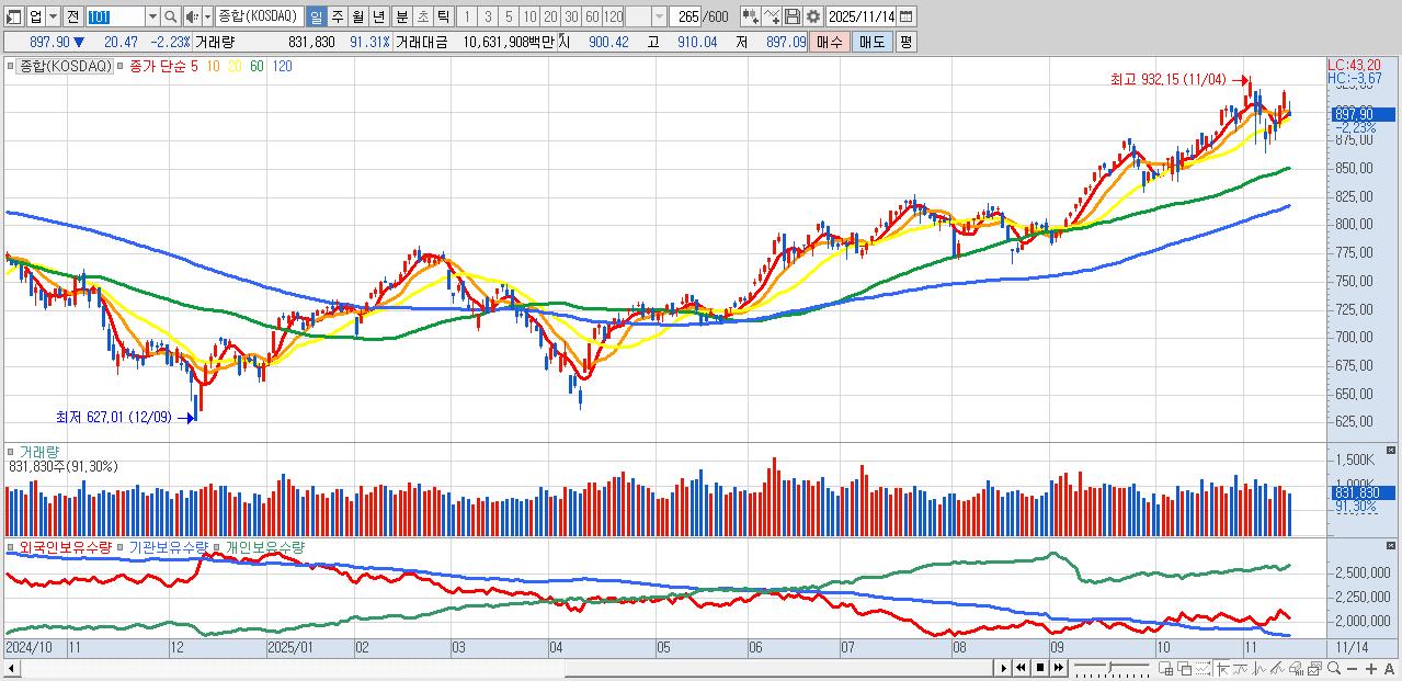 | 11/14 | 897.90 | ▼-2.23% | 3,818억 | -3,194억 | -295억 | -329억 |
