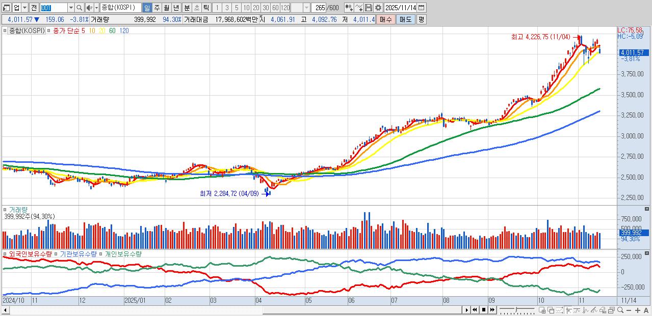 | 11/05 | 4,004.42 | ▼-2.85% | 25,538억 | -20,695억 | -1,877억 | -2,966억 |
