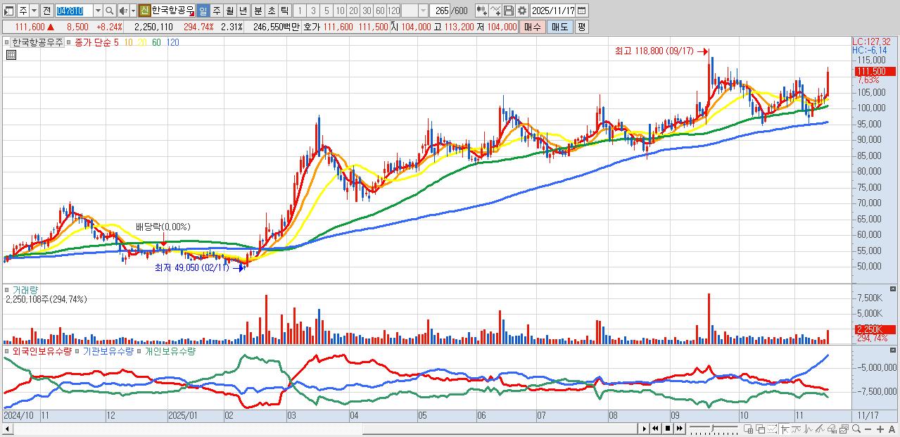 - 한국항공우주 (111,200원 ▲ 7.86% , 시총: 108,392억, 거래량: 1,390,666, 거래대금:1,525억)
