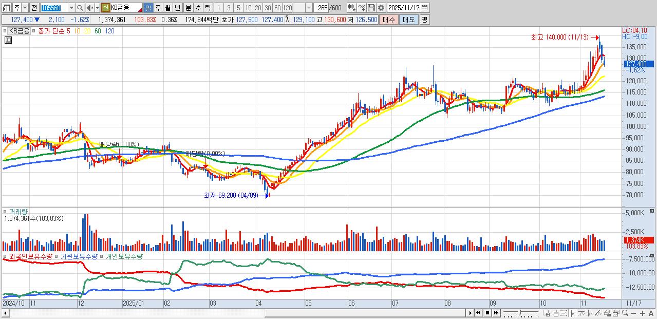 - KB금융 (126,800원 ▼ -2.08% , 시총: 483,694억, 거래량: 1,249,457, 거래대금:1,589억)