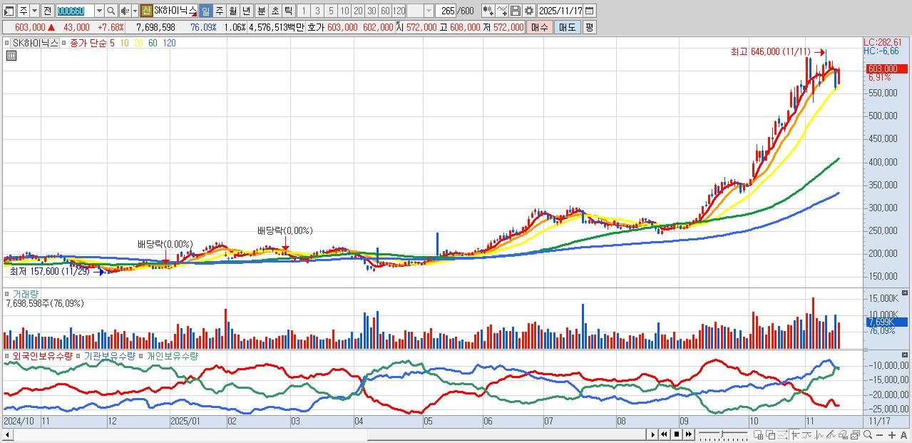 - SK하이닉스 (606,000원 ▲ 8.21% , 시총: 4,411,694억, 거래량: 4,470,947, 거래대금:26,636억)