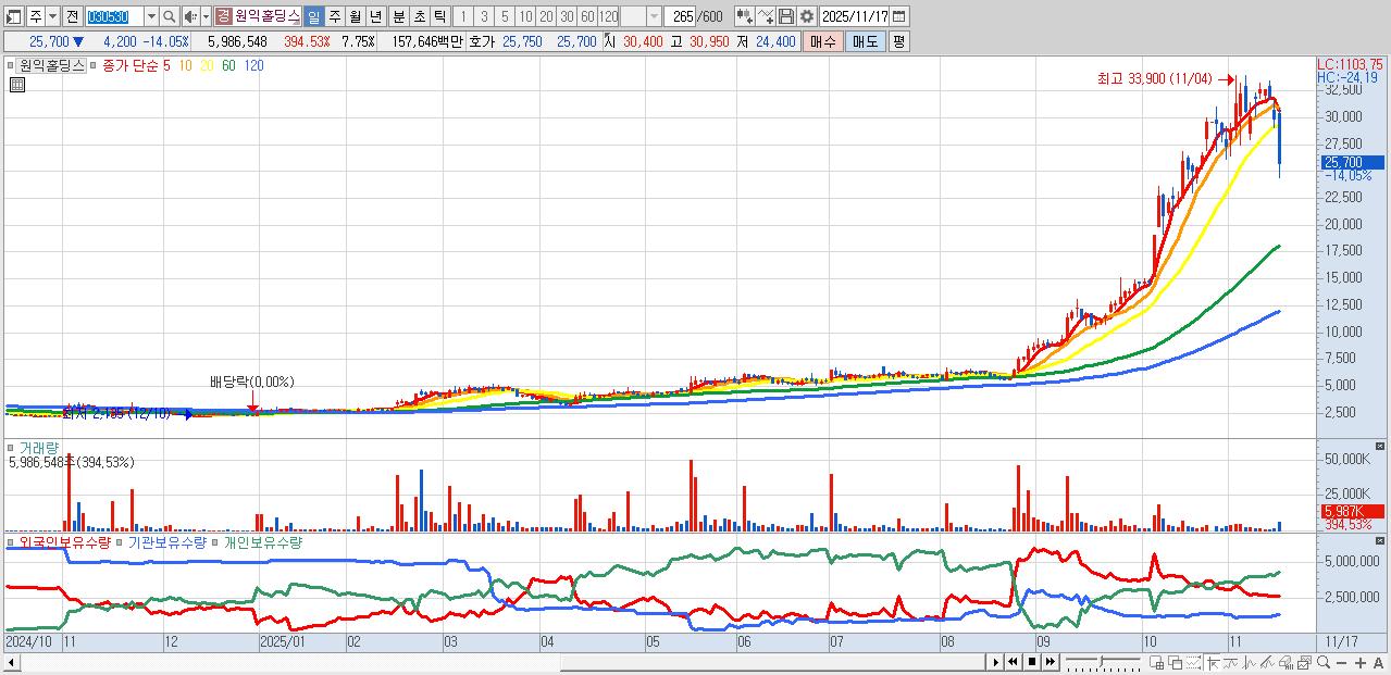 - 원익홀딩스 (25,700원 ▼ -14.05% , 시총: 19,850억, 거래량: 5,986,548, 거래대금:1,576억)