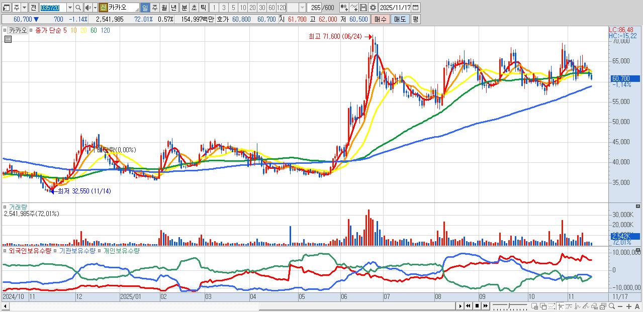 - 카카오 (60,700원 ▼ -1.14% , 시총: 268,527억, 거래량: 2,541,985, 거래대금:1,550억)