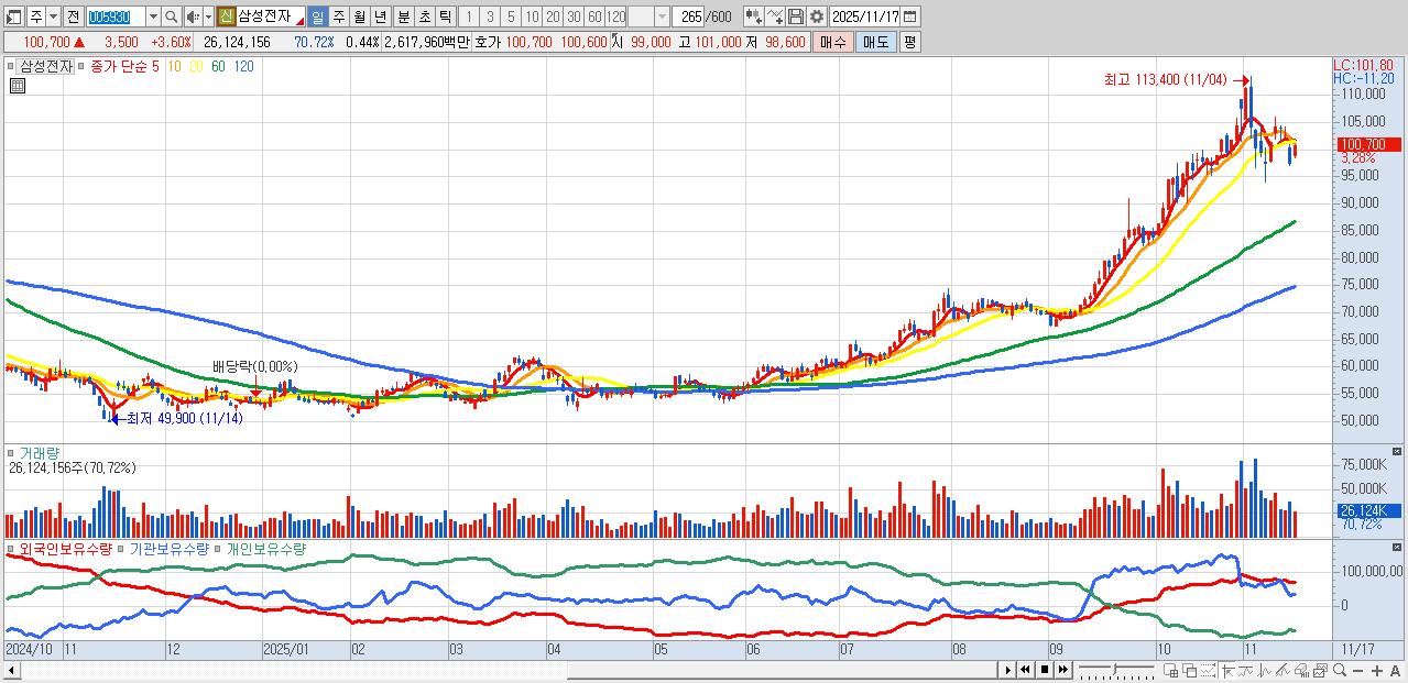 - 삼성전자 (100,600원 ▲ 3.5% , 시총: 5,955,156억, 거래량: 17,192,584, 거래대금:17,241억)