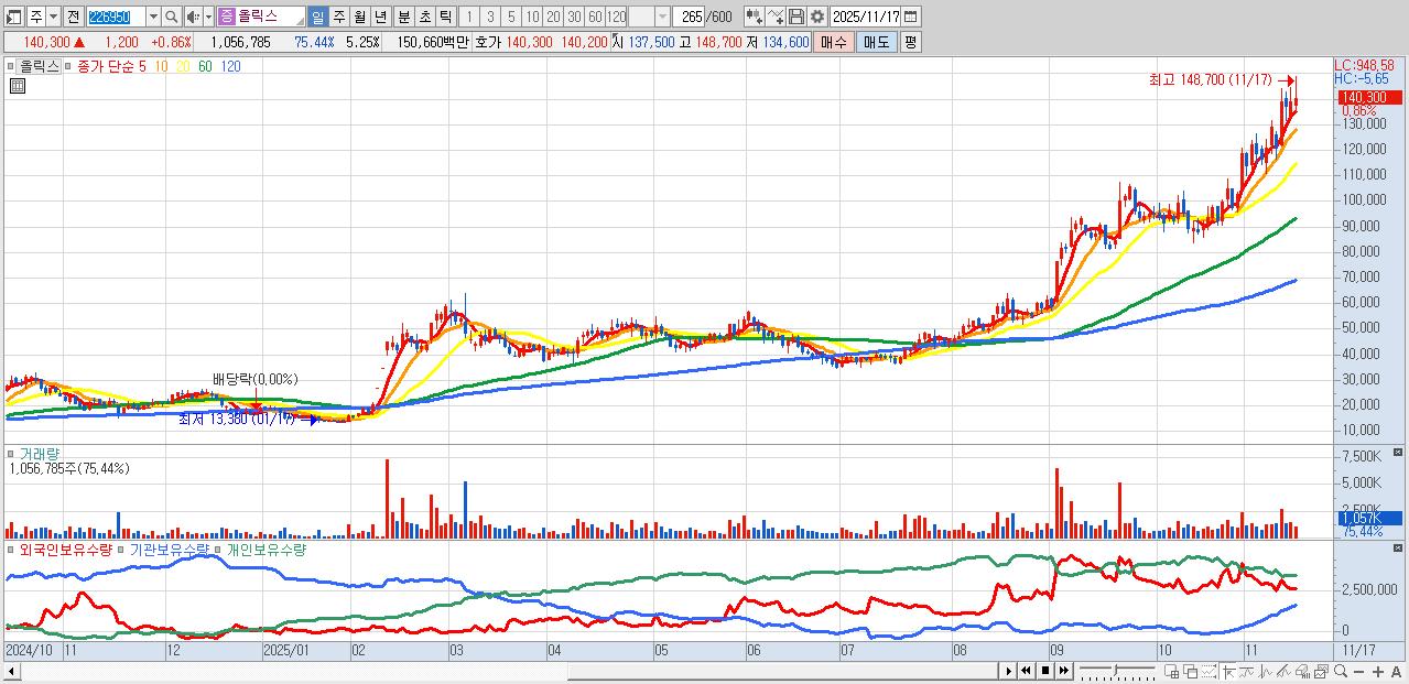 - 올릭스 (140,300원 ▲ 0.86% , 시총: 28,221억, 거래량: 1,056,785, 거래대금:1,507억)