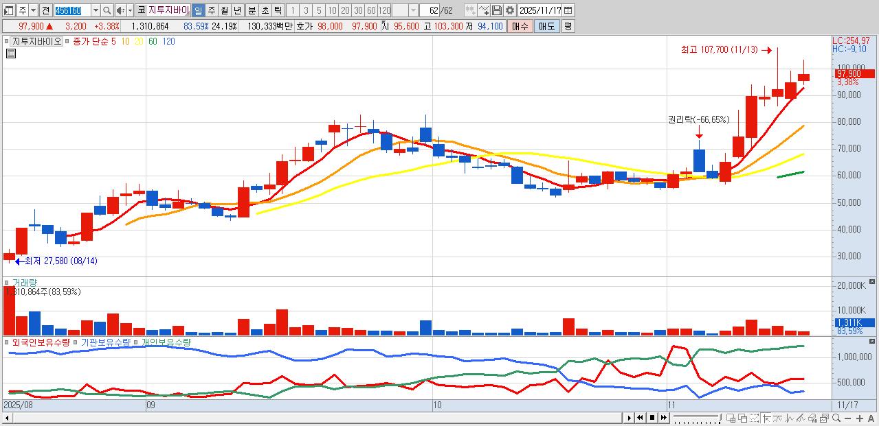 - 지투지바이오 (97,900원 ▲ 3.38% , 시총: 5,306억, 거래량: 1,310,864, 거래대금:1,303억)
