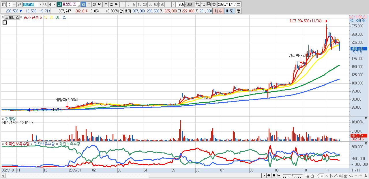 - 로보티즈 (206,500원 ▼ -5.71% , 시총: 27,300억, 거래량: 667,747, 거래대금:1,401억)