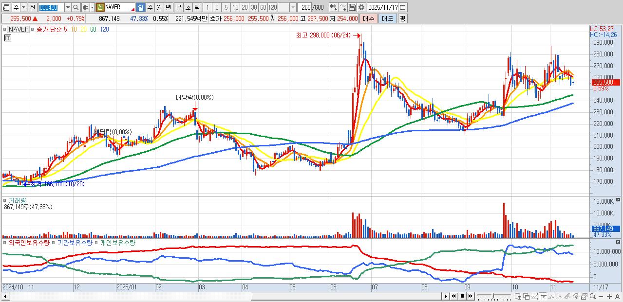 - NAVER (255,000원 ▲ 0.59% , 시총: 399,974억, 거래량: 507,818, 거래대금:1,297억)