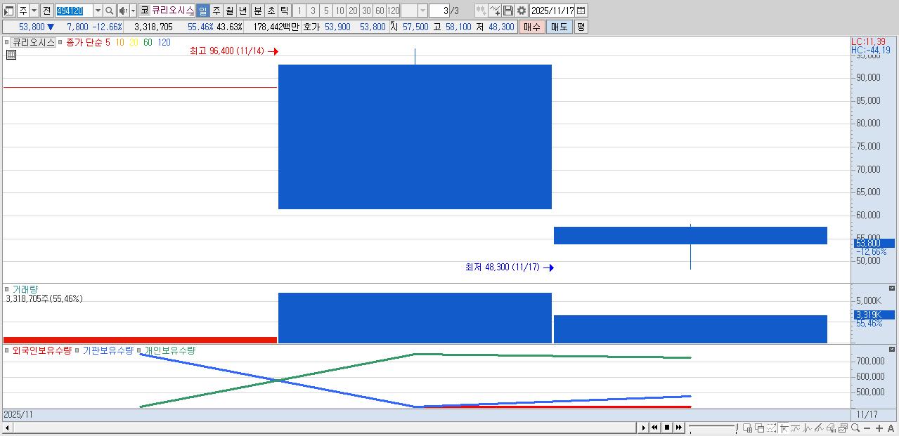 - 큐리오시스 (53,800원 ▼ -12.66% , 시총: 4,092억, 거래량: 3,318,705, 거래대금:1,784억)